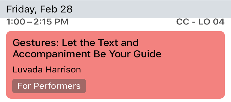 SETC 2020 Performers Workshop: Gestures: Let the Text & Accompaniment Be Your GuideWhat do I do with my hands? Is a glance sufficient? Come explore ways to use the text and the accompaniment as your guide to discover a more natural approach to gestures.Southeastern Theatre Conference, Kentucky International Convention Center, Louisville, KY, February 2020