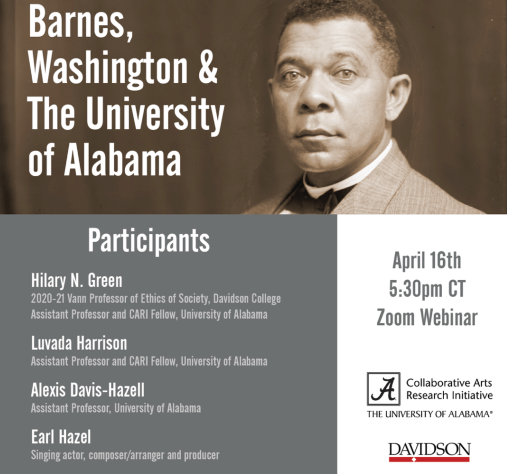 Oral Presentation: “Barnes, Washington & The University of Alabama: Recreating a 1910 Event for Understanding the Afterlives of Slavery in the 21st Century” Davidson College, Davidson, NC, April 2021