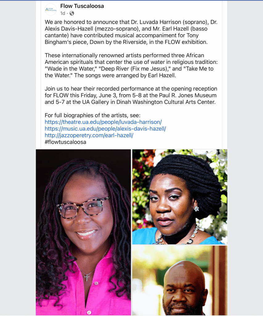 Dr. Julia Brock asked me to research and program music for “Down by the Riverside” an art installation created by artist Tony Bingham as part of the Flow Tuscaloosa Project supported by the Collaborative Arts Research Initiative. Dr. Alexis Davis-Hazell, Earl Hazell (arranged two of the spirituals) and I recorded three spirituals that focus on Baptism and water to support “Down by the Riverside.” Paul Jones Gallery Museum Gallery, June 2022