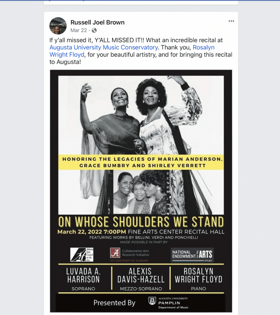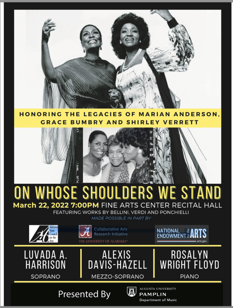 On Whose Shoulders We Stand: Honoring the Legacies of Marian Anderson, Grace Bumbry & Shirley Verrett. Guest Artist Recital, Pamplin Department of Music, Augusta University, Augusta, GA March 2022